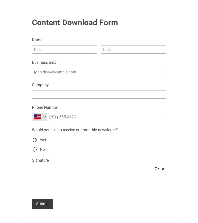 Easily capture leads with AbcSubmit free content download form template. Our form sample has the basics so you can start collecting online leads and then you can send great content newsletters and engage your prospective customers. Integrate with over 1000 apps, send personalized emails and set up advanced workflows. Build your lead form with now!