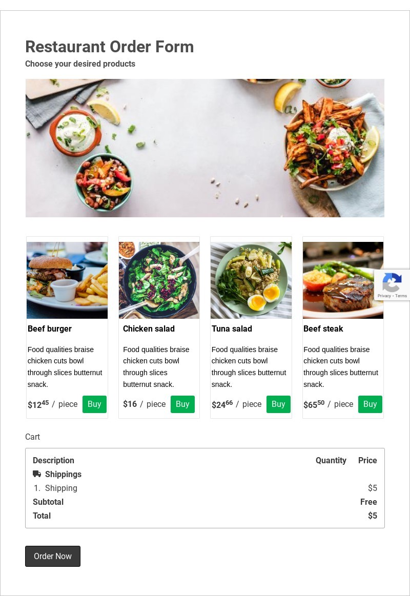 Search for online free forms? This is the right place. This free Restaurant Order Form allows customers to make an order and provides a delivery address through the restaurant website. It is useful to quickly process your orders online and get paid with cash on-site integration. Simply customize this form template, embed it on your online website, and watch as submitted orders are automatically sent straight to your AbcSubmit account, on your email, Slack channel, Google Sheets, or any other desired app. Easily personalize your Restaurant Order Form with our free Form Builder. Add your logo, update the fonts and colors to match your branding, add your menu, photos, and descriptions of your dishes. And if you’d like to accept card payments online, just integrate with a trusted payment processor like Square, PayPal, Braintree, or Stripe!