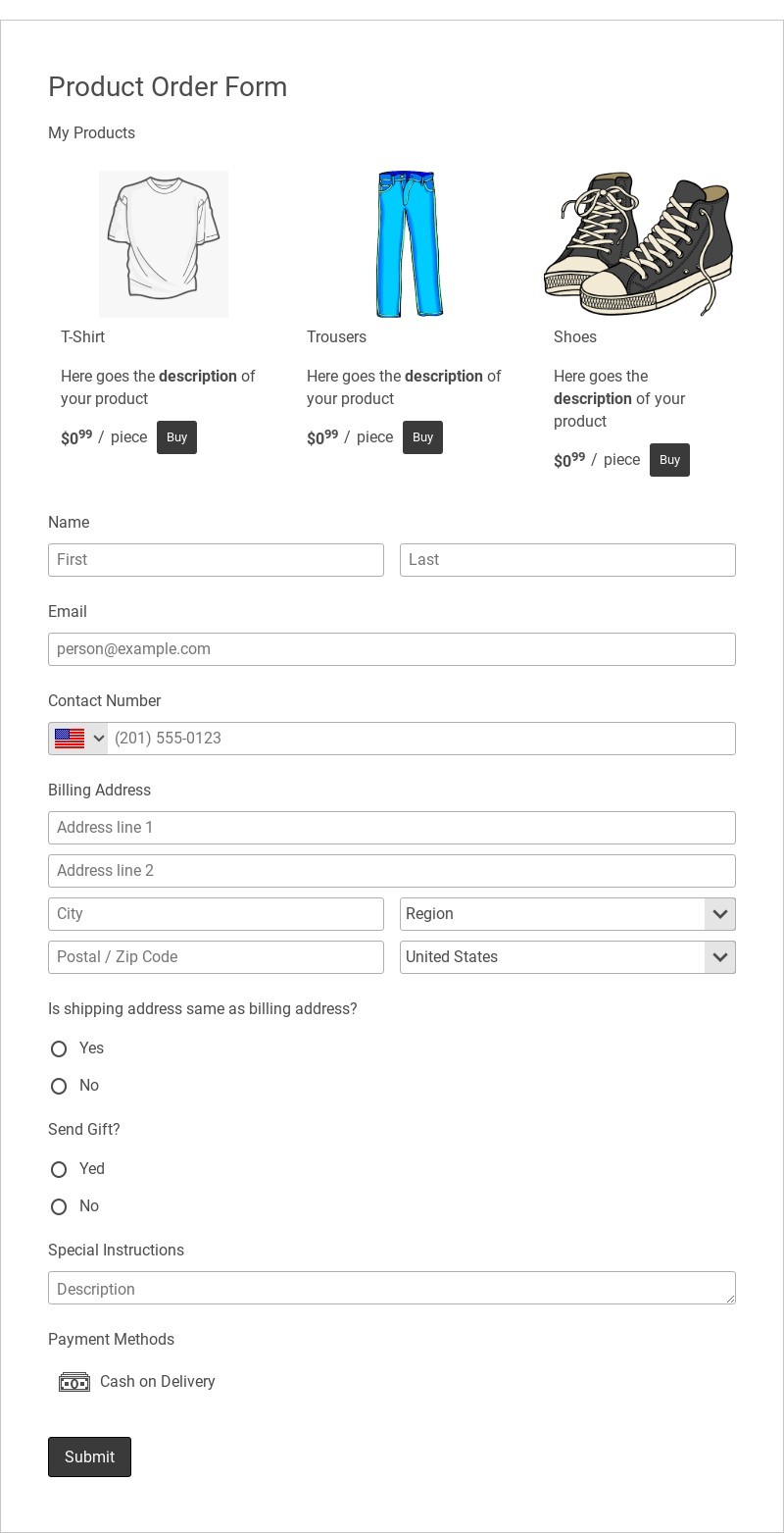 This product order form template is a fast way to get started selling online. The template is fully customizable, enabling you to add new fields, design it to match your brand, and add new products to sell. Best of all, you can connect this order form to an AbcSubmit payment partner and collect money directly through the form itself, reducing back-and-forth emails when you need to get paid after an order request. We won't charge you additional fees for accepting payments. To boost productivity even more, simply select one of AbcSubmit’s Product Order Form Templates and customize the design to match your business with our Form Builder.