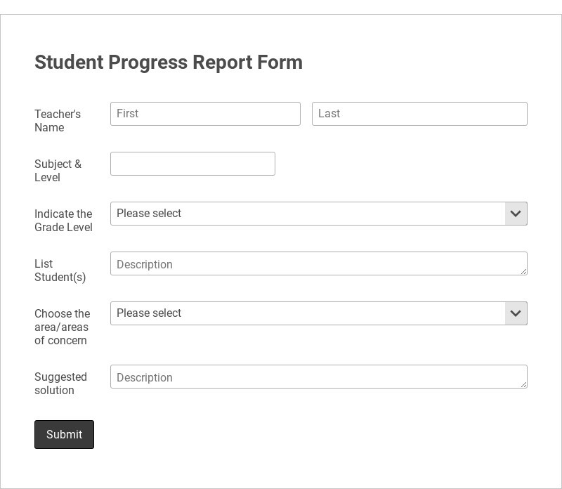 Are you a teacher and you are searching for a ready to use progress report forms? Here's a free student progress report template that you can use to monitor your student's progress. Although there are plenty of student progress report formats, this template would be a good starting point that can be customized. The student progress report sample form contains questions that will help improve your student's performance on his/her academic ability, focus, or both. Use our free forms to create and style amazing online forms, attach workflows, integrate with other apps, and collect your form entries and files in a database with one easy and powerful form maker!