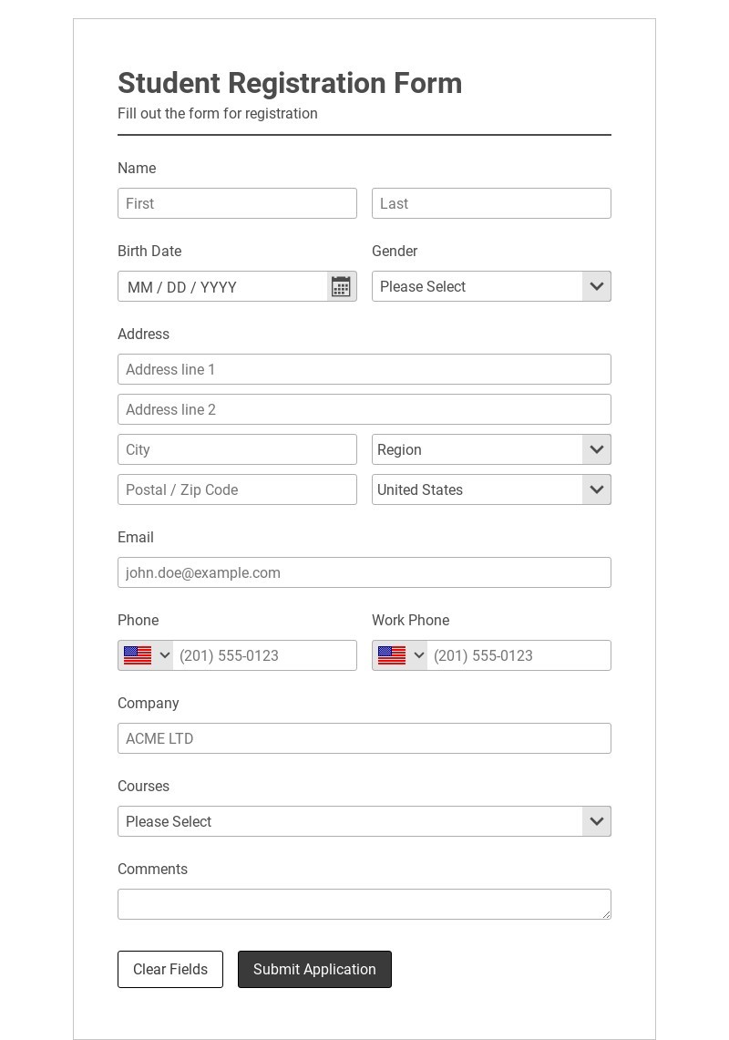 AbcSubmit's free class registration form sample can be used by any school to accept registration on various educational programs that the school offers to its students. Use this template in order to gain some speed for creating your registration form. This template is highly customizable and mobile-ready. You can add extra fields and change the form design based on your needs.