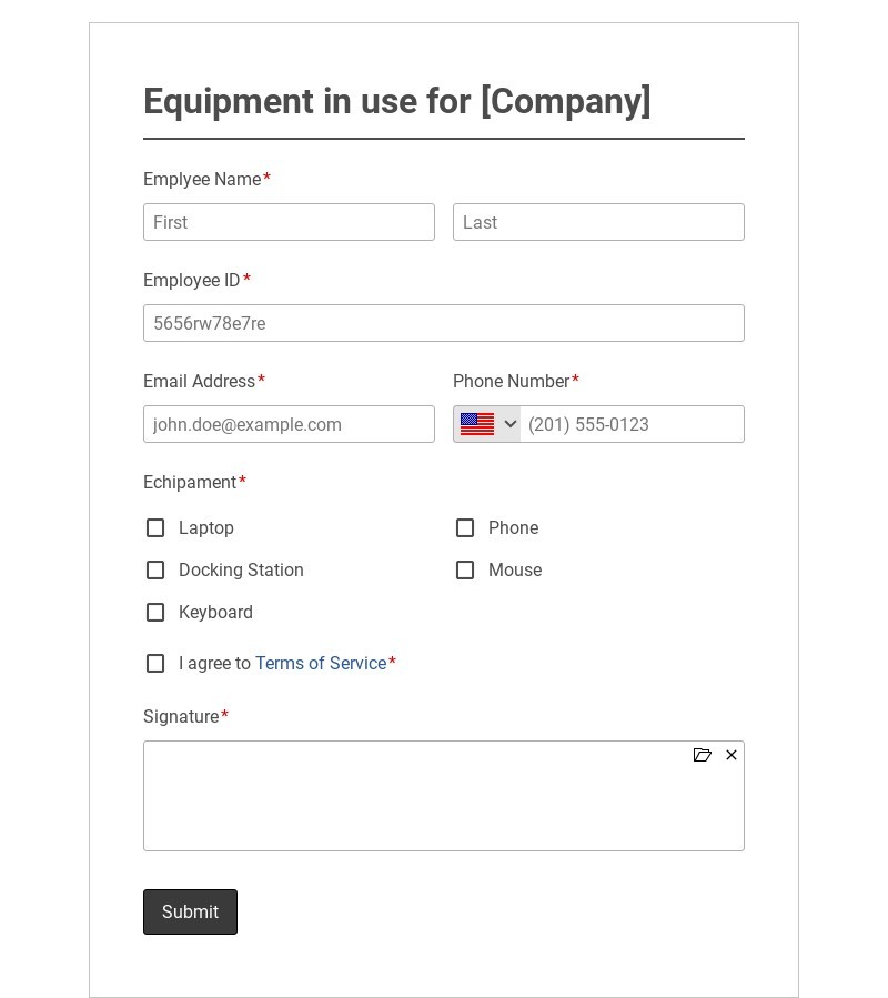 Need to track assets? Track your company assets with our free equipment checkout form sample. Ensure you know exactly what equipment goes where with this equipment checkout form template. Set up email notification, save your form data inside a database collection, build form workflows, set up approvals and you have a safe way to track your assets. Build forms with AbcSubmit's Form Builder today!